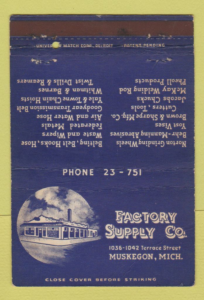 Details About Matchbook Cover Factory Supply Company Muskegon Mi Wear 40 Strike