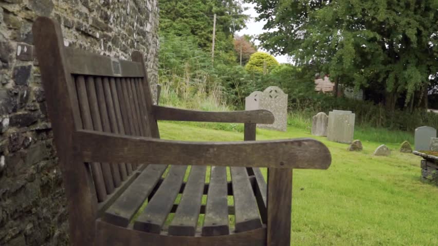 Wooden Bench In A Churchyard Or Graveyard Of A Church