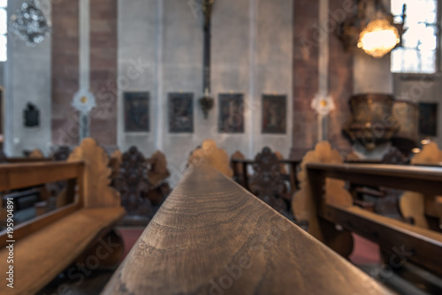 Selective Focus Wooden Bench Catholic Church Stock Photo