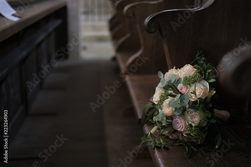 Bouquet Of Roses On A Bench In A Church Stock Photo And
