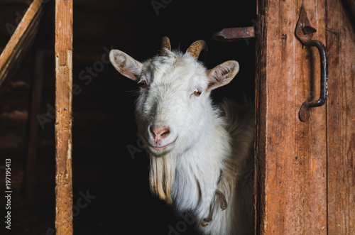 A White Horned Goat Peeks Out From Behind The Barn Door