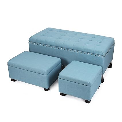 Homebeez Bonded Leather Tufted Accents Rectangular Storage Bench Ottoman Footstool Set Of 3 Blue
