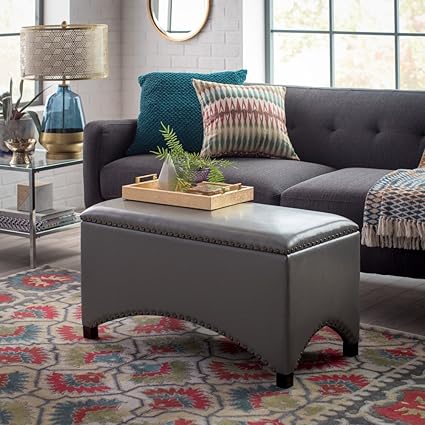 Gray premium bonded leather storage bench ottoman coffee table nailhead accents contemporary home furnishings. Inches high x 36 inches wide x inches deep. Only 3 left in stock order soon.