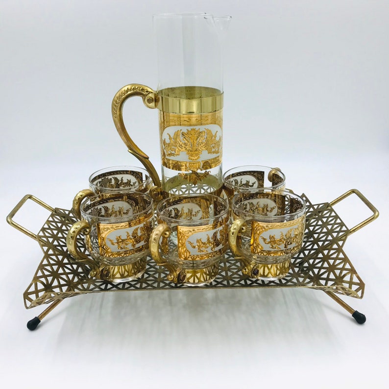 Vintage Russian Martini Cocktail 22k Gold Barware Lowball Set Mcm Dragon Mid Century