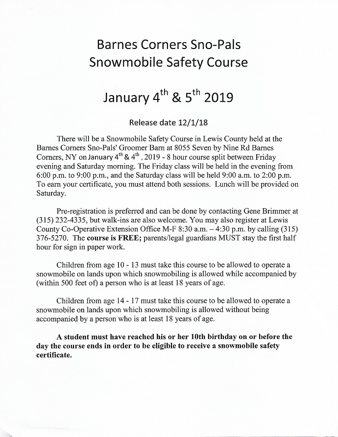 Snowmobile Safety Course Scheduled For January 4th And 5th
